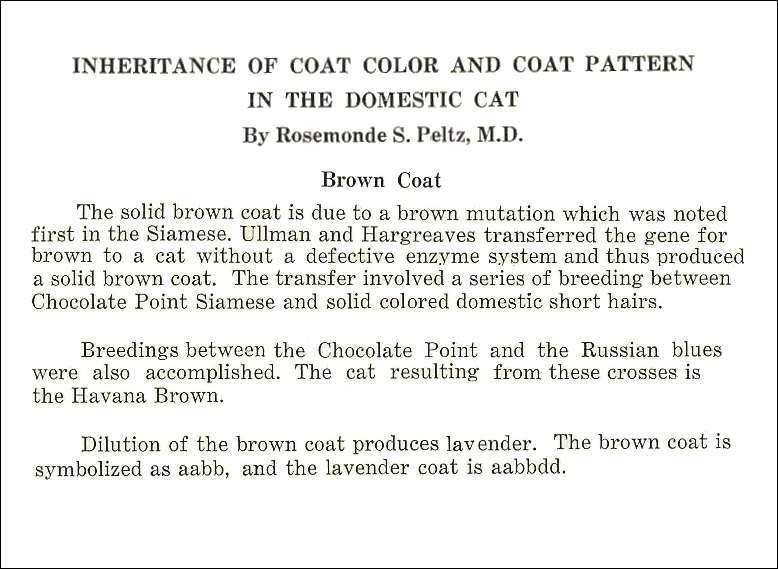 This excerpt was taken from "Inheritance of Coat Color and Coat Pattern in the Domestic Cat" written by Rosemonde Peltz and published in the 1965 CFA Yearbook.